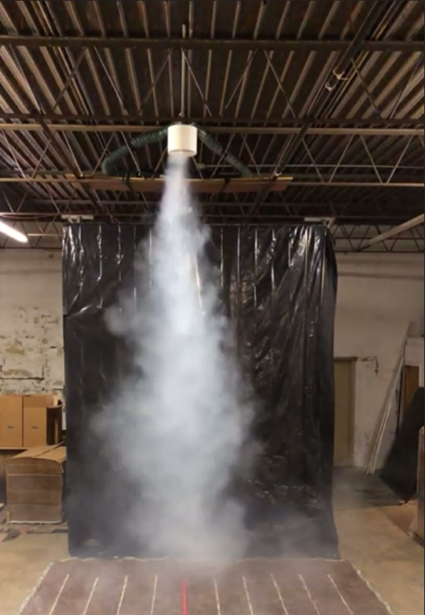 Air-Row Fans used its new test lab to create a “smoke test” to show how air already there — trapped at the ceiling — is gathered and pushed to the floor in a straight column, spreading slowly as it hits the floor.